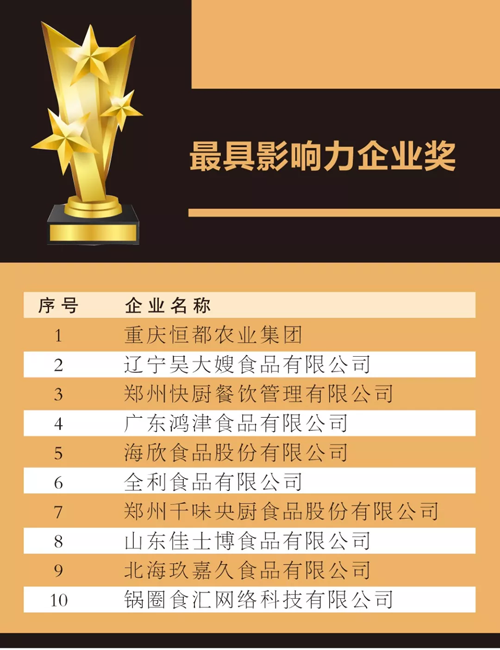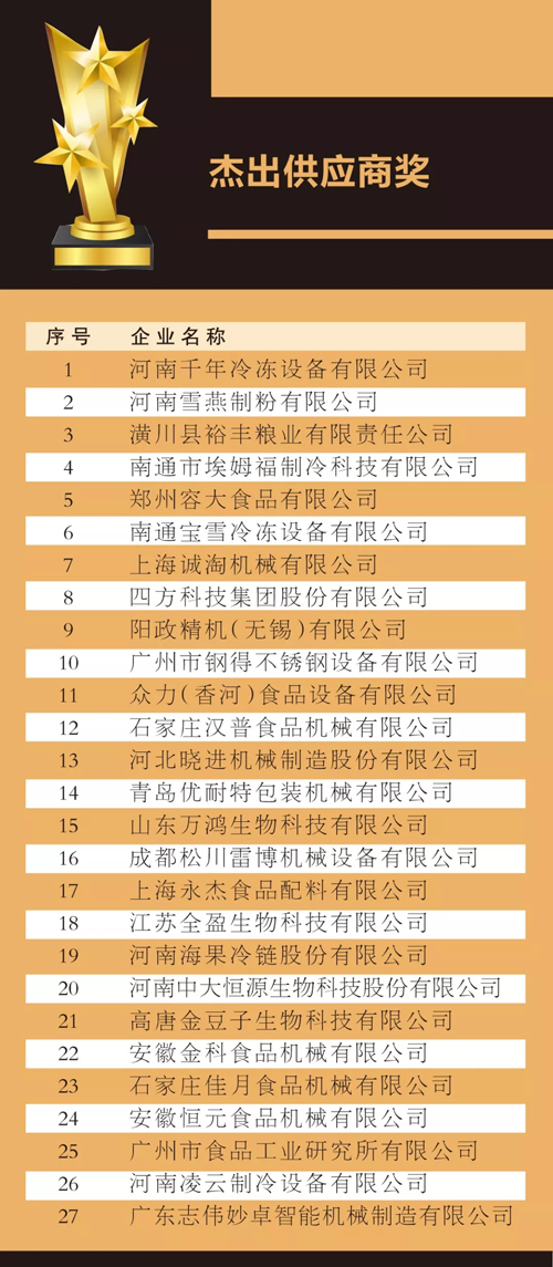 來源: 冷凍食品網 發布者:編輯8月18日上午,在2019中國冷凍食品產業大會優秀展商頒獎典禮上,最具影響力企業獎、技術創新獎、成長新星產品獎、杰出供應商獎4大獎項名單滾燙出爐。